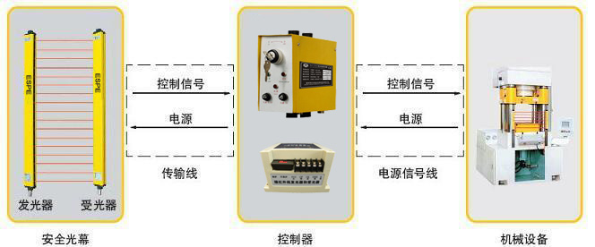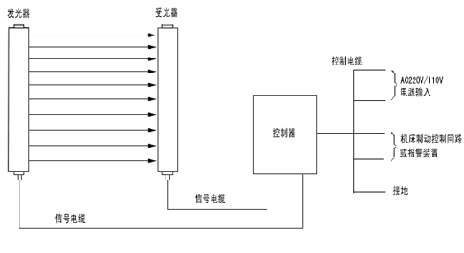 安全光幕發(fā)光器發(fā)出的光直射到受光器,形成保護光幕。當(dāng)安全光幕被遮擋時,受光器產(chǎn)生一遮光信號,通過信號電纜傳輸?shù)娇刂破?,控制器將此信號進行處理,產(chǎn)生一控制信號,控制機床的制動控制回路或其它設(shè)備的報警裝置,實現(xiàn)機床停車或安全報警。