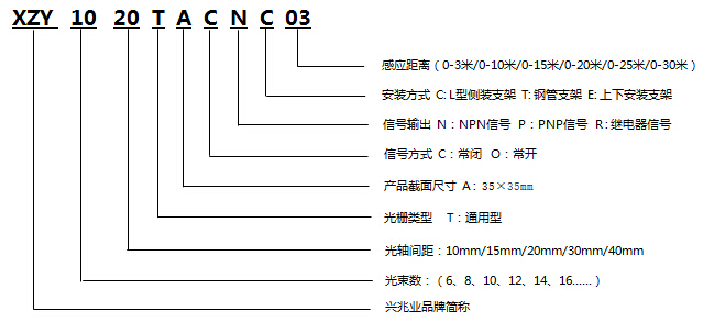 就舉一個小例子,XZY1020TACNC03,其代表的意思是,XZY是指興兆業(yè)品牌的簡稱;10表示的是安全光柵光束數(shù):(6、8、10、12、14、16……);20表示的是安全光幕的光軸間距:10mm/15mm/20mm/30mm/40mm,作為專業(yè)的安全光幕廠家,其他的光軸間距都是可以定制的;T代表的是光柵類型,T:通用型,B:小型,C:超薄型;A表示安全光柵產(chǎn)品截面尺寸, A : 35×35mm,B:29*30mm,C:18*35mm;C表示信號方式, C:常閉, O:常開;N表示安全光柵的信號輸出,N:NPN信號,P:PNP信號,R : 繼電器信號;C表示的是安全光柵的安裝方式,C: L型側(cè)裝支架,T: 鋼管支架 E: 上下安裝支架 ;03表示的是安全光幕的感應(yīng)距離(0-3米/0-10米/0-15米/0-20米/0-25米/0-30米)。下面,就用圖片示意說明,希望讓您一目了然的了解我們興兆業(yè)安全光幕的型號。