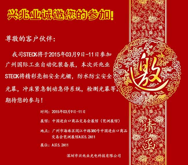本次展會,興兆業(yè)將積極部署,全方位考量用戶關(guān)心的問題,從用戶本位出發(fā)精心策劃。在展位的設(shè)計和布置上力求凸顯以用戶為中心的興兆業(yè)STECK特色,彰顯安全光柵安全、環(huán)保、防水防塵等,以新穎的構(gòu)思、簡約而不簡單的設(shè)計風(fēng)格,力求帶給參觀者更具深度的互動體驗(yàn)。本次興兆業(yè)STECK將精彩亮相安全光柵,防水防塵安全光幕,沖床緊急制動急停系統(tǒng),檢測光幕,相信興兆業(yè)的安全光柵為民眾帶來驚喜,同時也將為2015廣州國際工業(yè)自動化技術(shù)增光添彩!同時,在展會期間,興兆業(yè)STECK的知名工程師、技術(shù)測試師,名牌客服等將悉數(shù)到場,與來賓分享興兆業(yè)的安全光柵、測量光柵,探討、洽談相關(guān)產(chǎn)品合作等,歡迎各位前來E17展號廳進(jìn)行參觀、咨詢、研究、探討!
